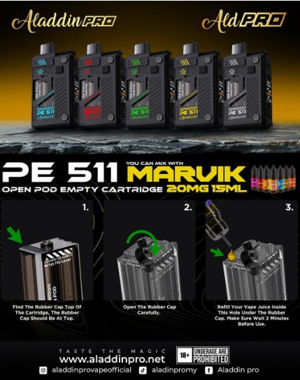 The Aladdin Pro PE511 is a powerful disposable pod device offering up to 18,000 puffs per cartridge. It features a screen with puff counter, adjustable voltage, and sweetness control. The device is draw-activated and delivers a premium vaping experience. Available in full starter kits and cartridge-only options.