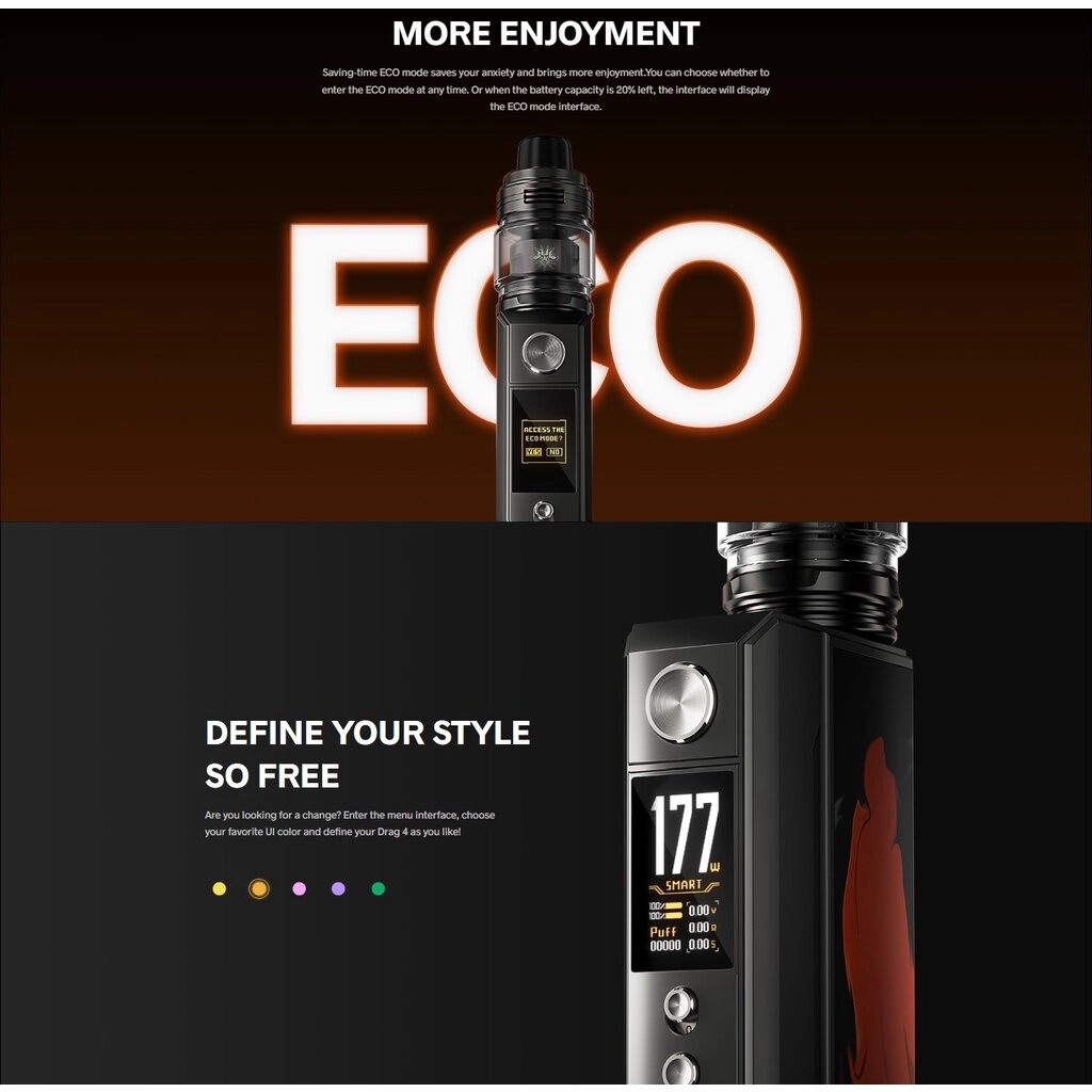 DRAG 4, released by VOOPOO in 2022, is the fourth-generation MOD of the DRAG series. Continuing the refined design of DRAG series mods, DRAG 4 inherits classic natural resin and includes new timeless wood grain elements, each DRAG 4 is unique in appearance. Equipped with an ingenious leak-proof top airflow UFORCE-L Tank, DRAG 4 delivers the ultimate vaping enjoyment while being efficient leakage-proof.